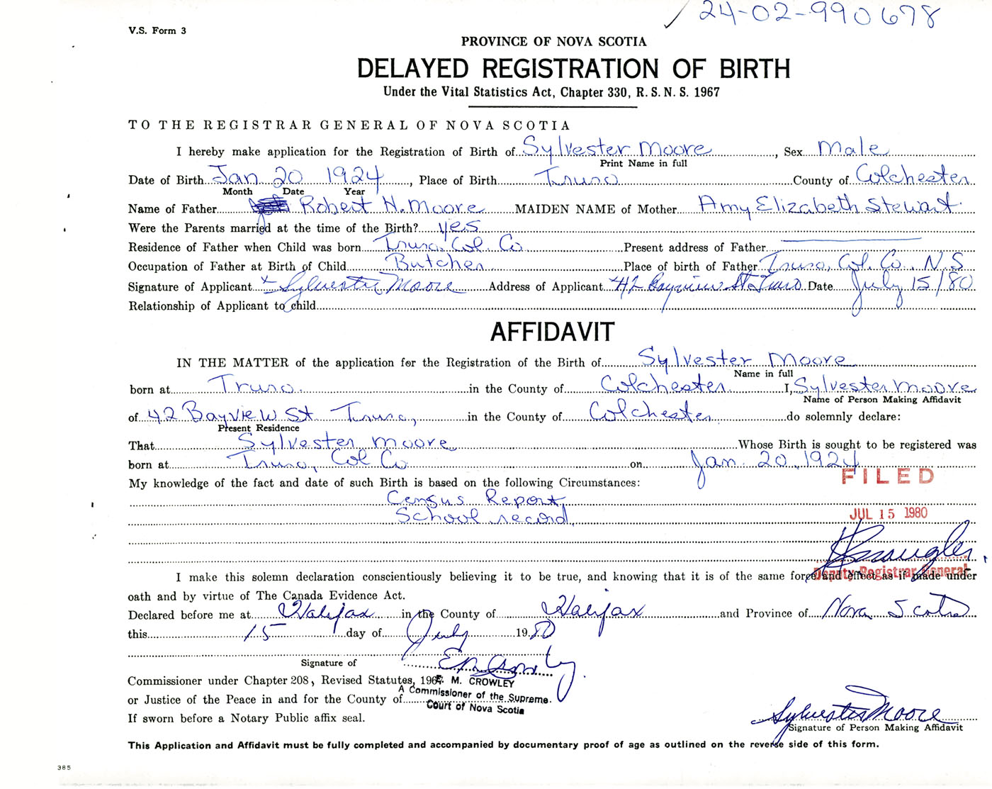 Signature of Applicant Sylvester Moore Address of Applicant 42 Bayview Street, Truro, Colchester Co., NS Date 15 July 1980