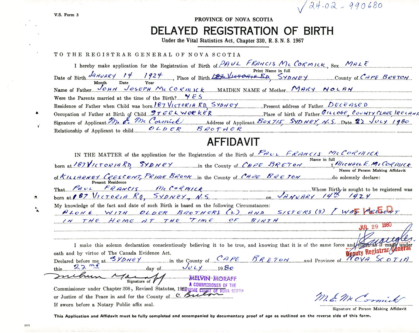 I hereby make application for the Registration of Birth of Paul FrancisMcCormick Sex Male
