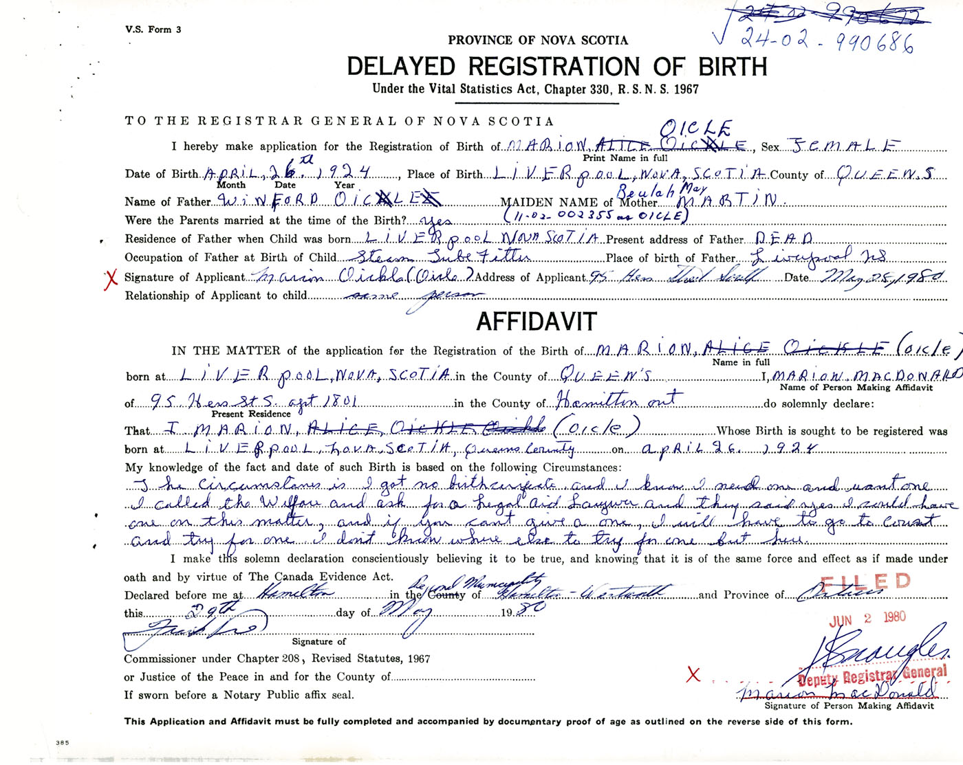 IN THE MATTER of the application for the Registration of the Birth of MarionOicle
