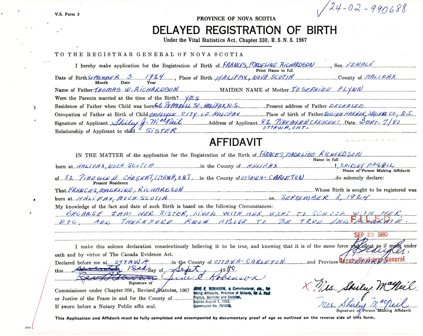 Signature of Applicant Shirley J. MacNeil Address of Applicant 82 Pine Glen Crescent, Ottawa, Ontario Date 7 September 1980