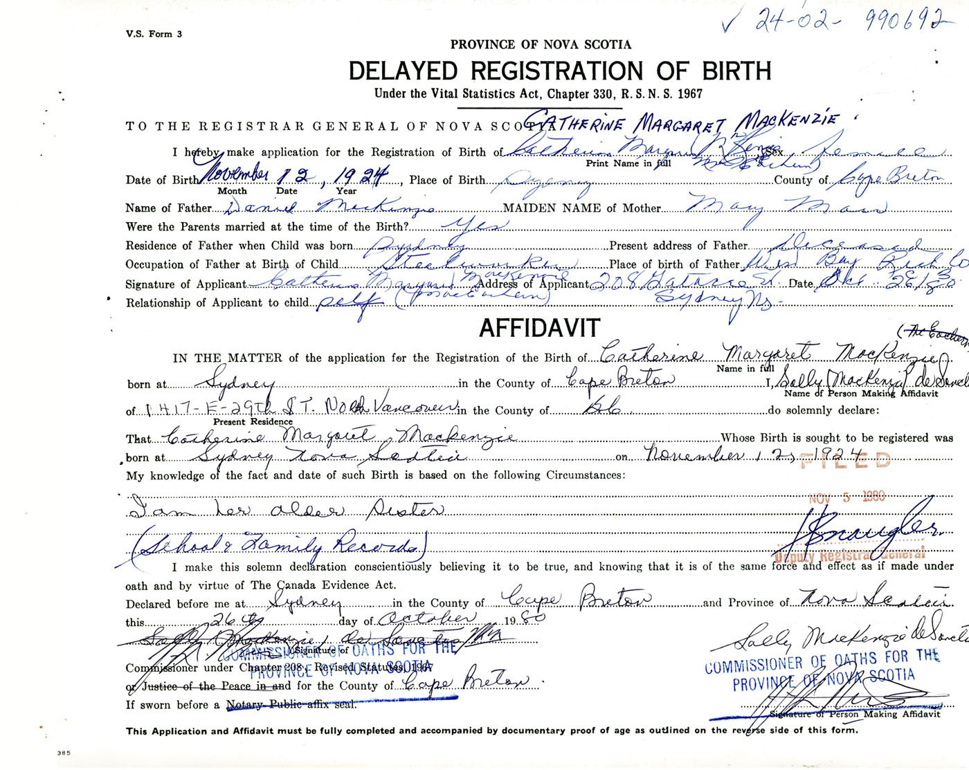 Signature of Applicant Catherine Margaret MacKenzie Address of Applicant 208 Gatacre Street, Sydney, Cape Breton Co., NS Date 26 October 1980