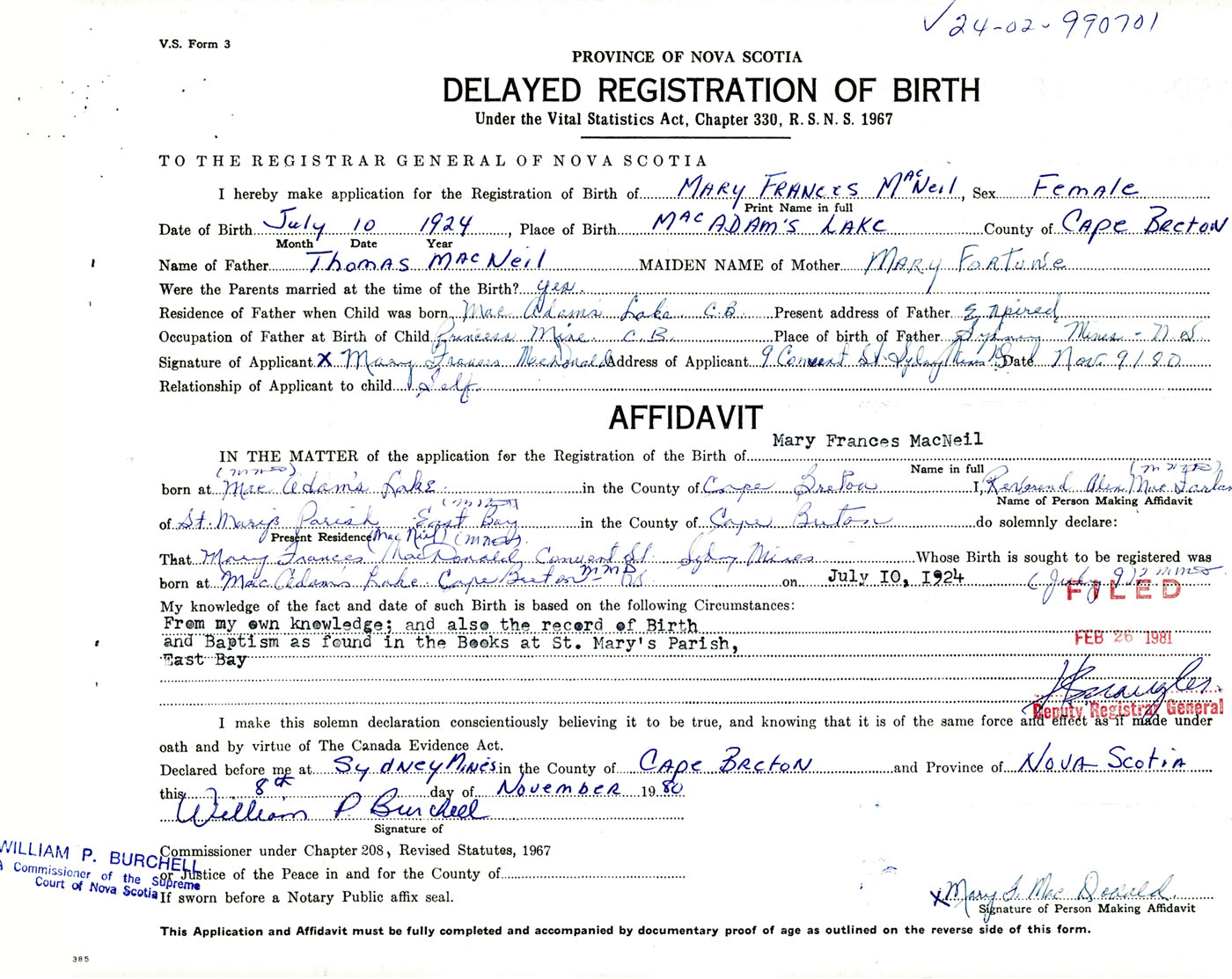 Date of Birth July 10, 1924 Place of Birth McAdam LakeCounty of Cape Breton