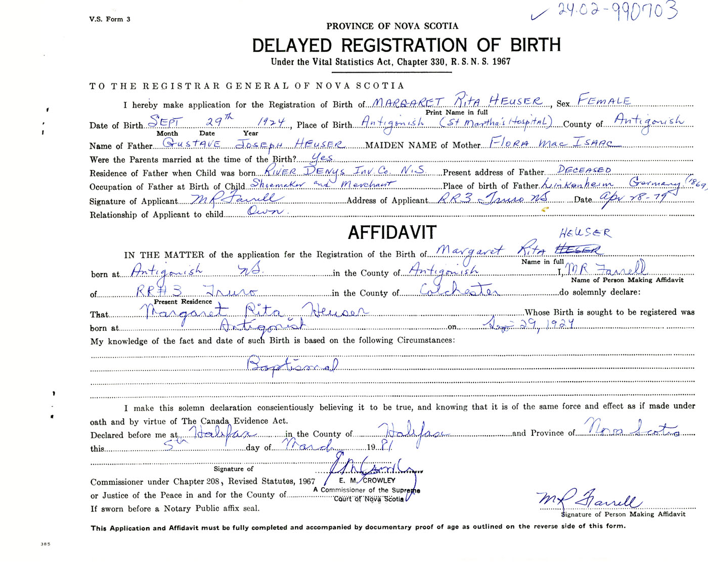 IN THE MATTER of the application for the Registration of the Birth of Margaret RitaHeuser