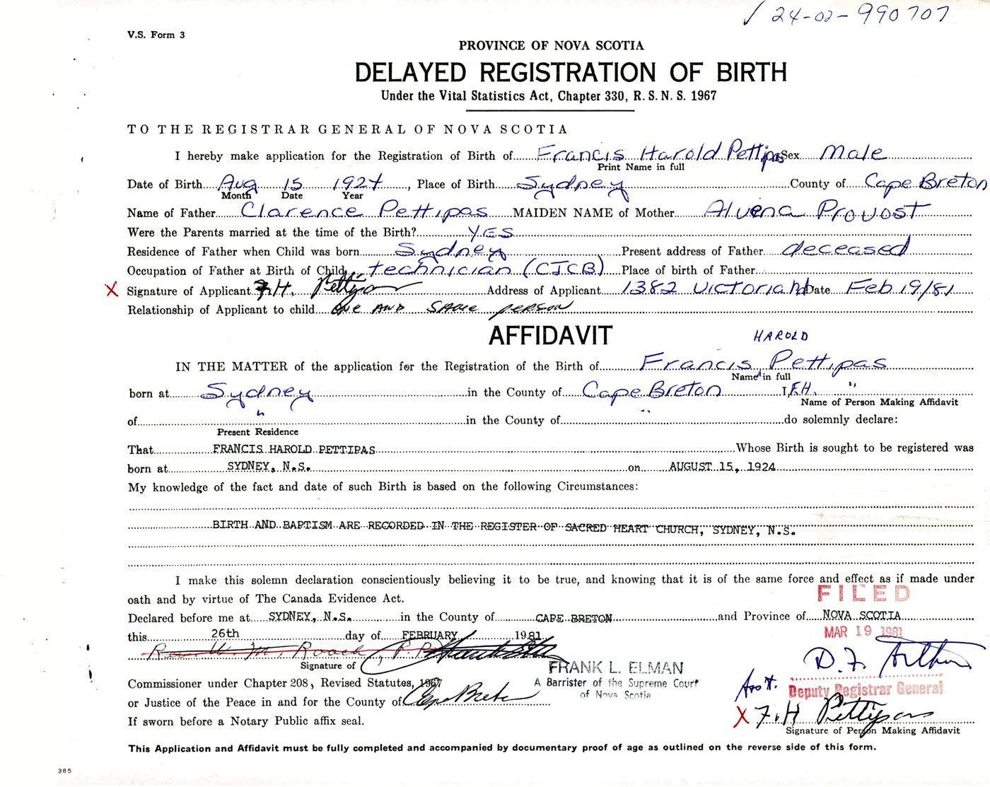 I hereby make application for the Registration of Birth of Francis HaroldPettipas Sex Male