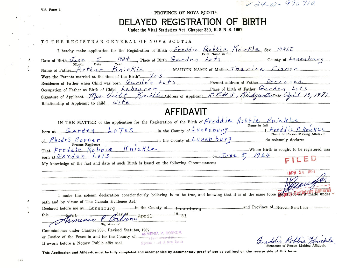 I hereby make application for the Registration of Birth of Freddie RobbieKnickle Sex Male