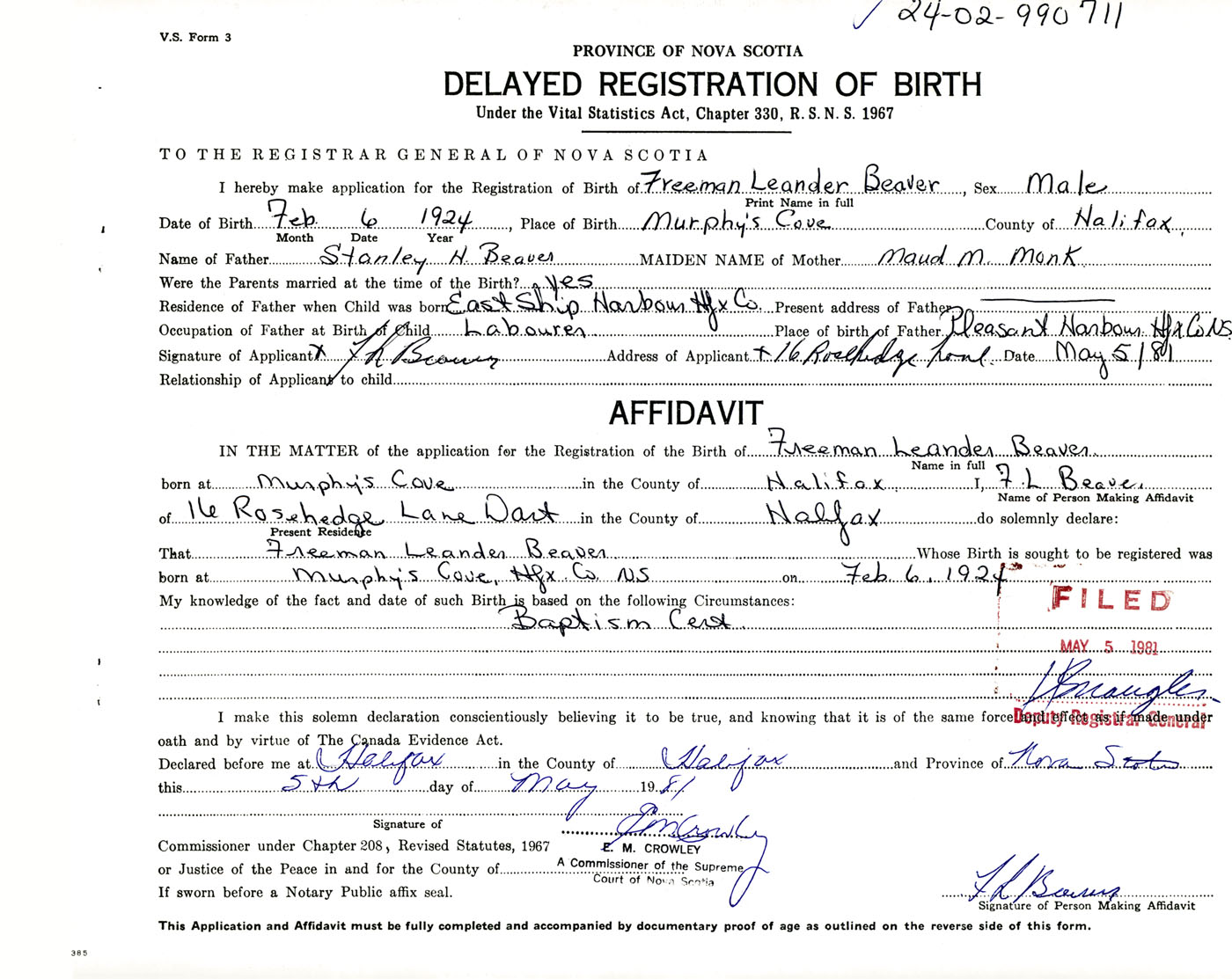 I hereby make application for the Registration of Birth of Freeman LeanderBeaver Sex Male