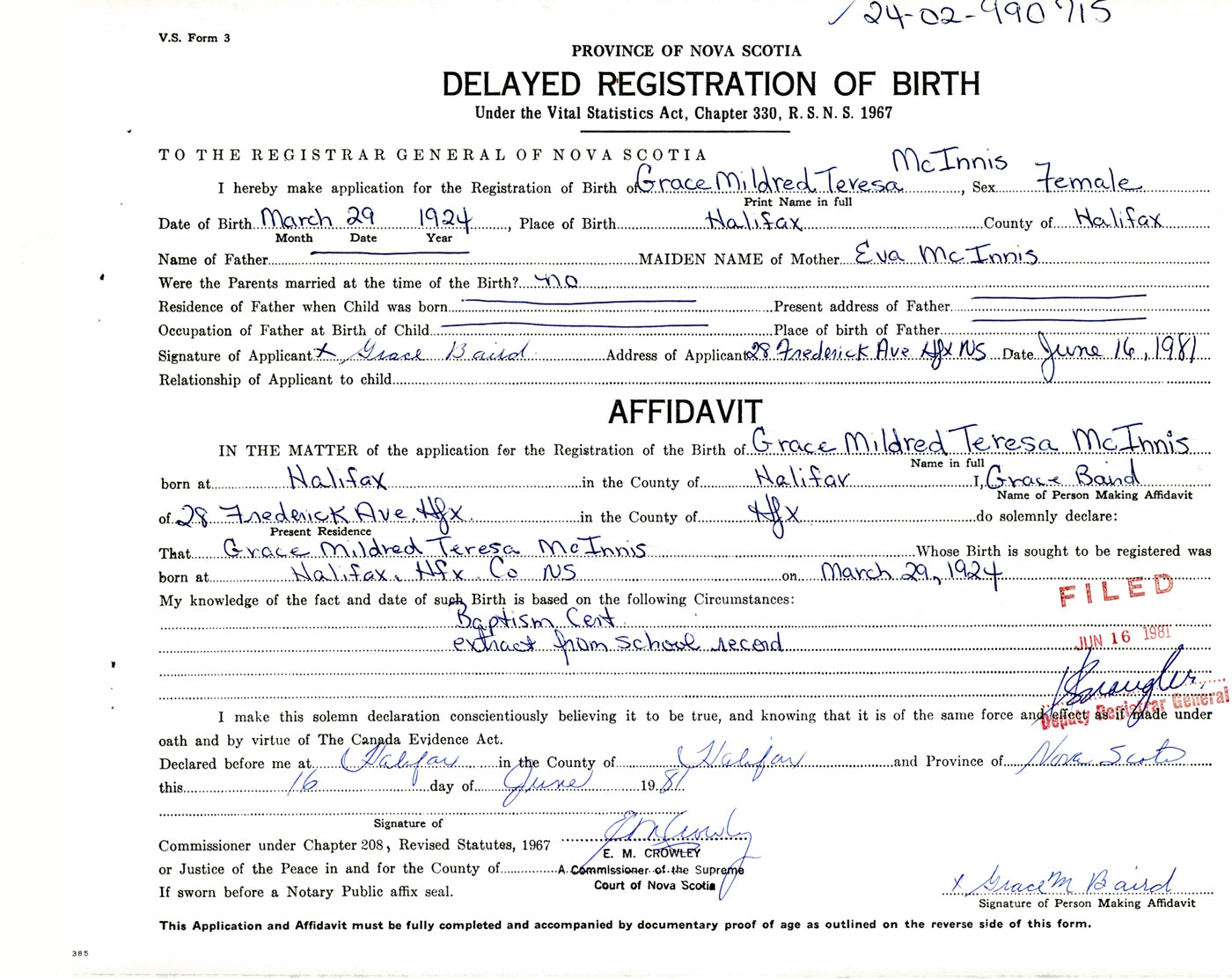 IN THE MATTER of the application for the Registration of the Birth of Grace Mildred TeresaMcInnis