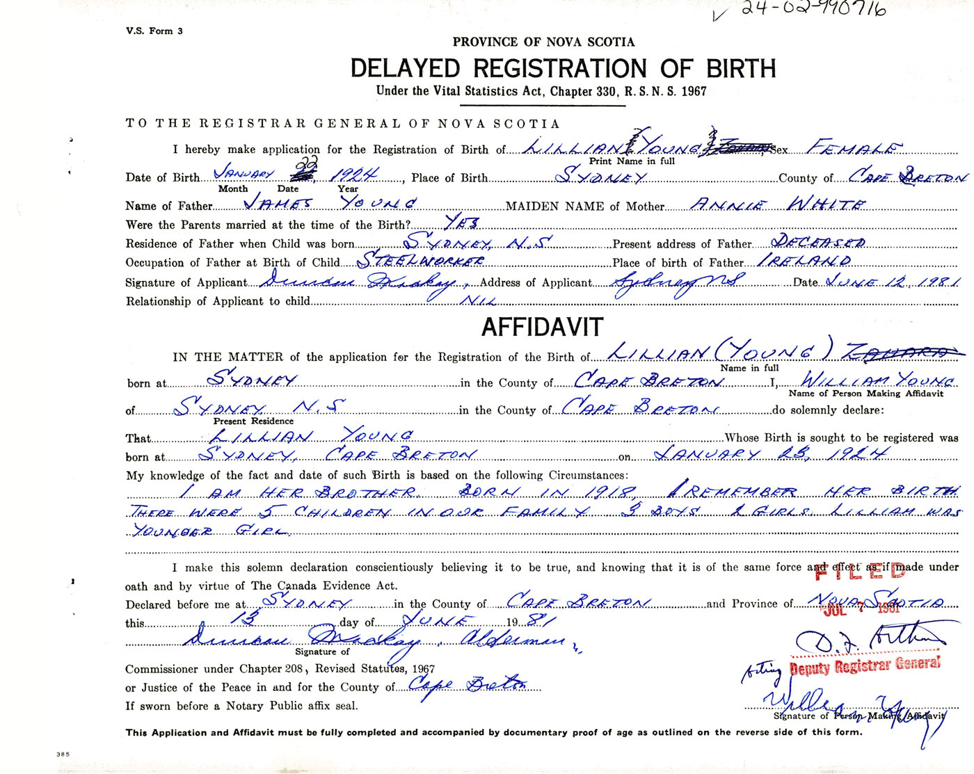 I hereby make application for the Registration of Birth of LillianYoung Sex Female
