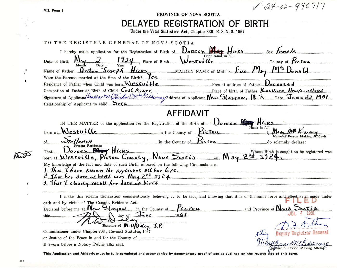 Signature of Applicant Doreen M. (Hicks) MacGillivray Address of Applicant New Glasgow, Pictou Co., NS Date 22 June 1981