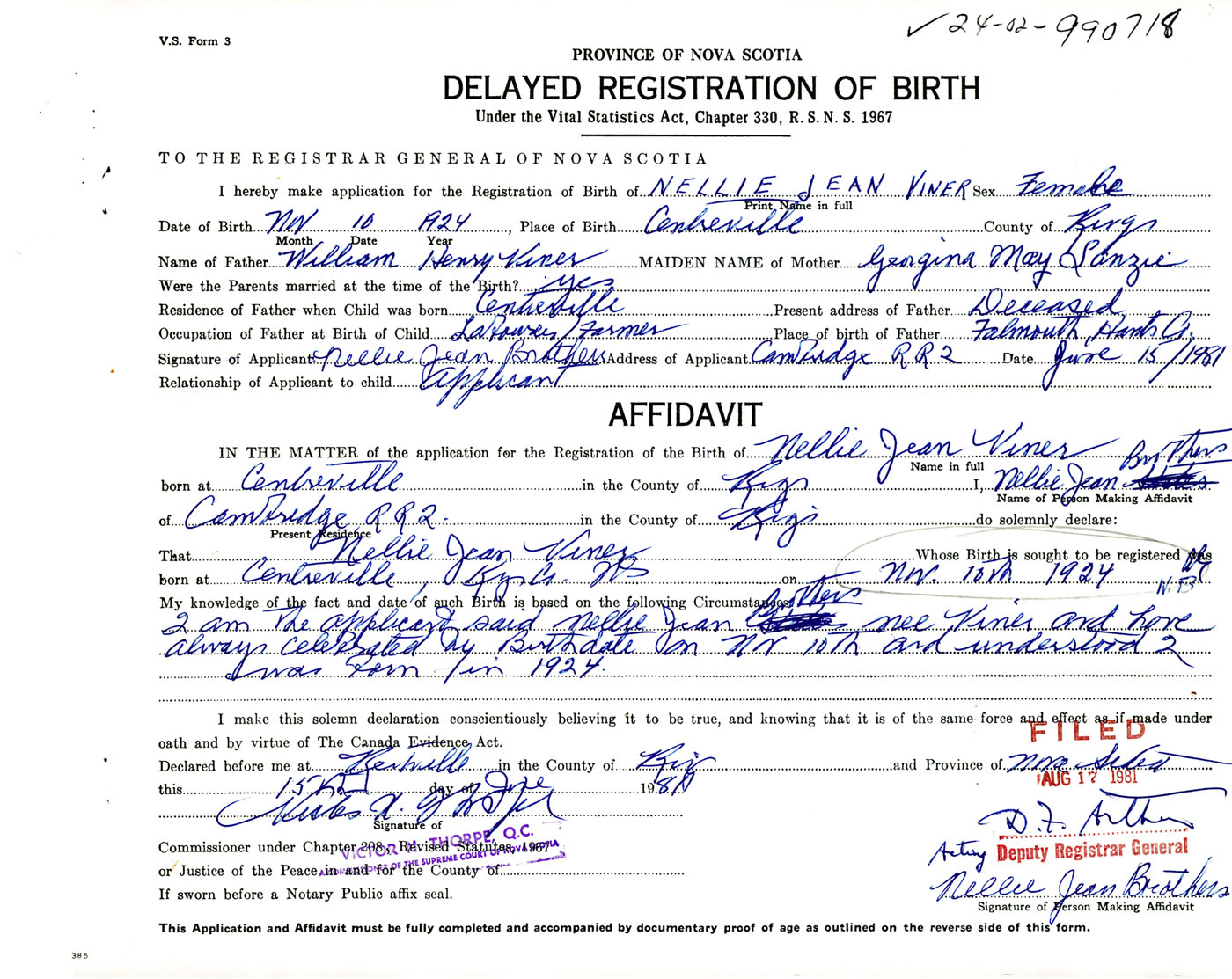 Signature of Applicant Nellie Jean Brothers Address of Applicant RR #2, Cambridge, Kings Co., NS Date 15 June 1981