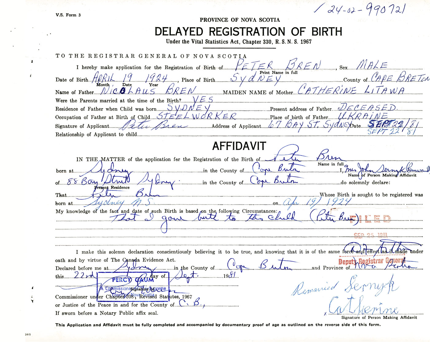 Signature of Applicant Peter Bren Address of Applicant 67 Bay Street, Sydney, Cape Breton Co., NS Date 22 September 1981