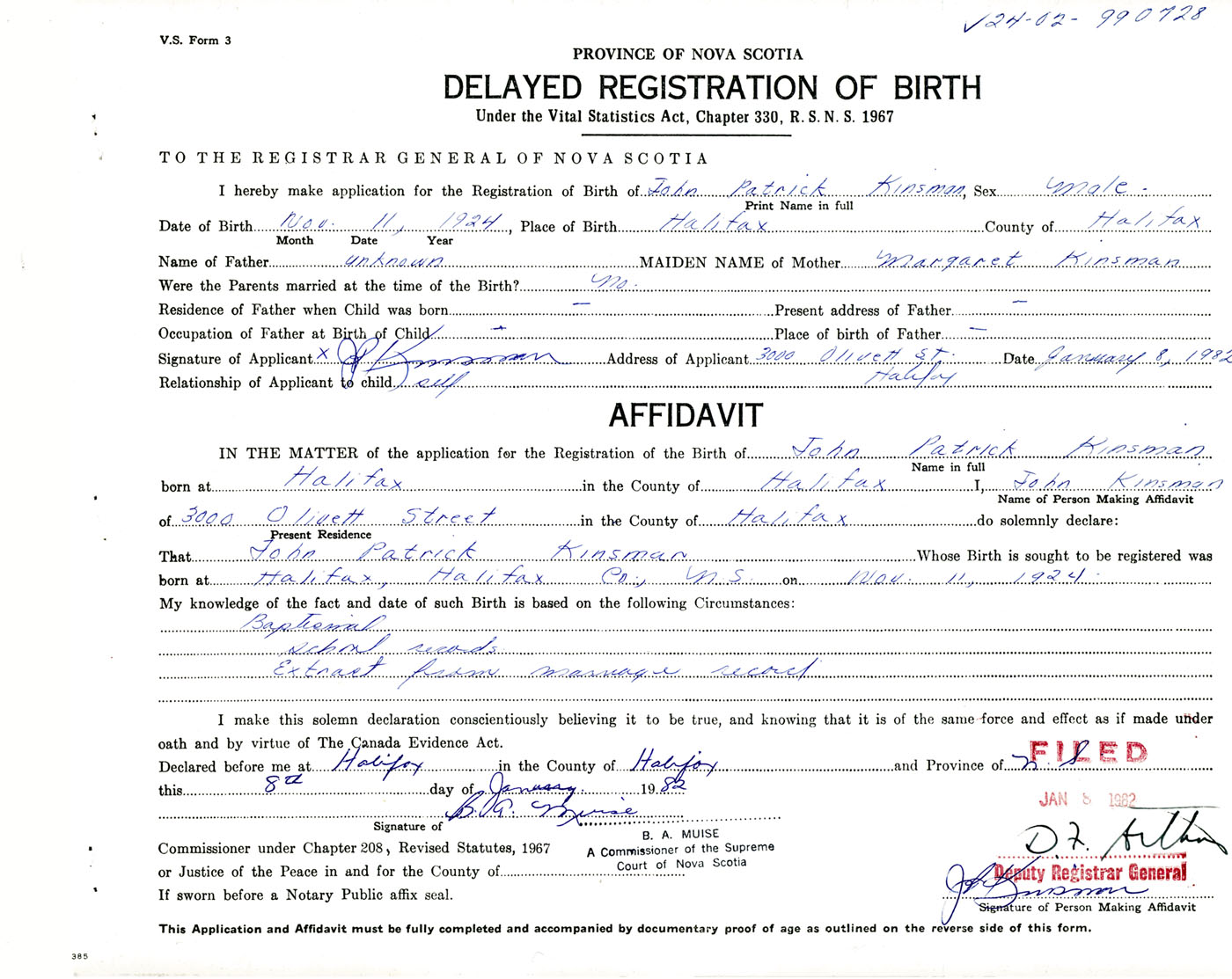 I hereby make application for the Registration of Birth of John PatrickKinsman Sex Male