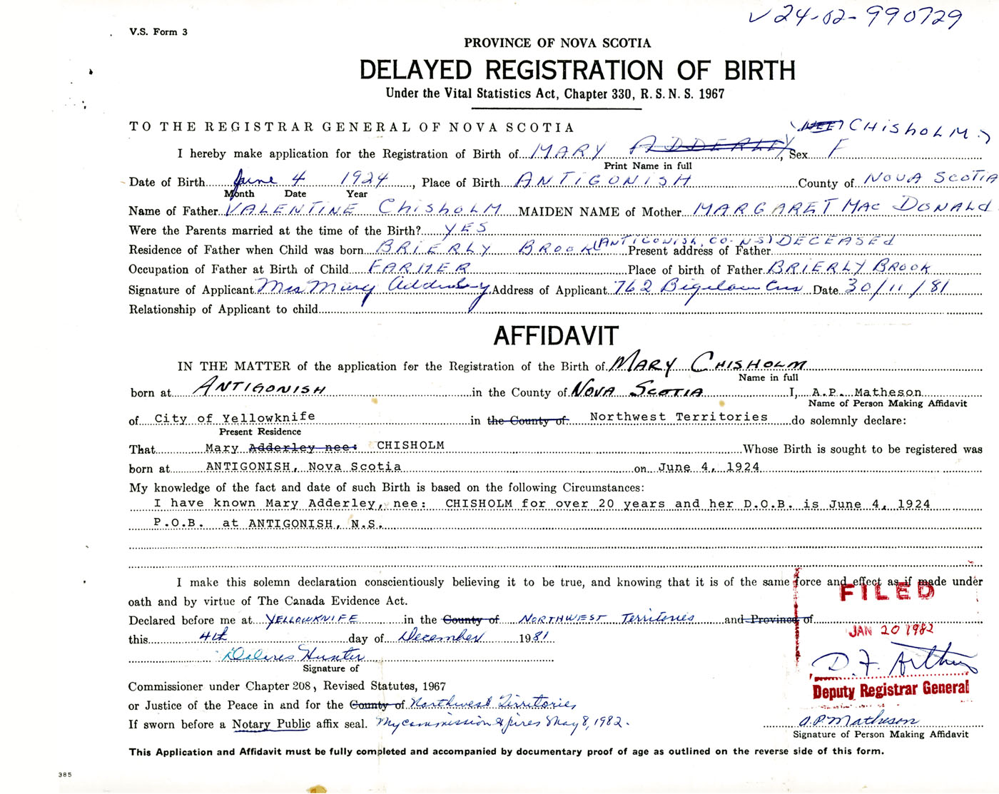 IN THE MATTER of the application for the Registration of the Birth of MaryChisholm