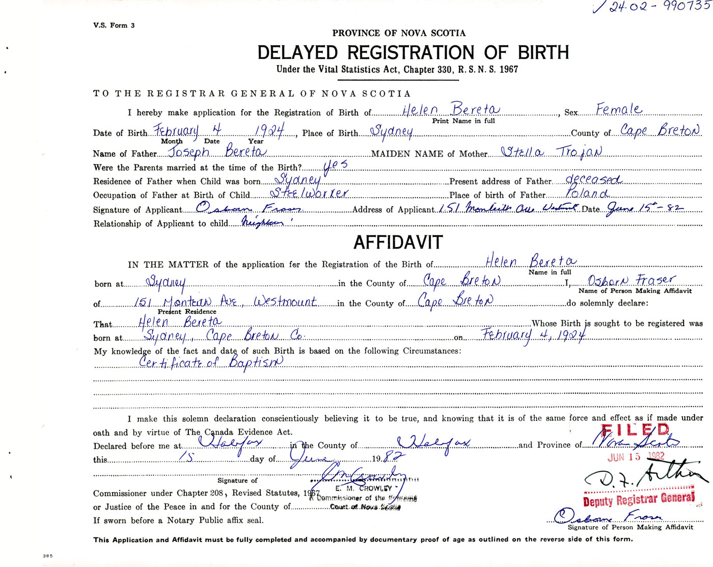 I hereby make application for the Registration of Birth of HelenBereta Sex Female