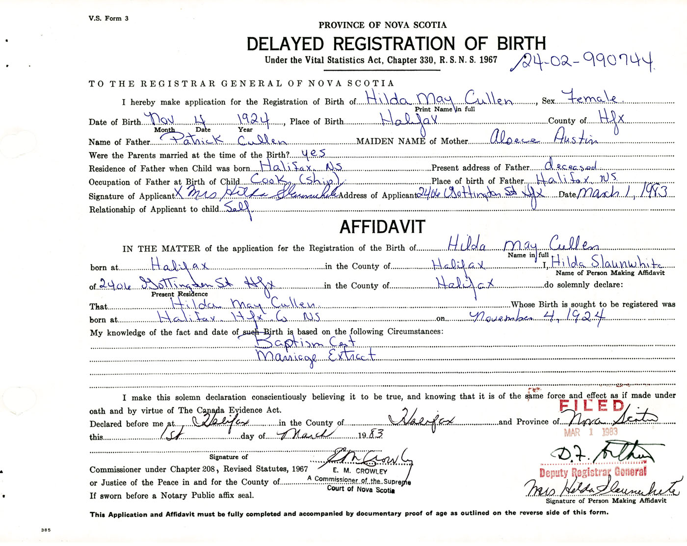 Signature of Applicant Mrs. Hilda Slaunwhite Address of Applicant 2406 Gottingen Street, Halifax, NS Date 1 March 1983