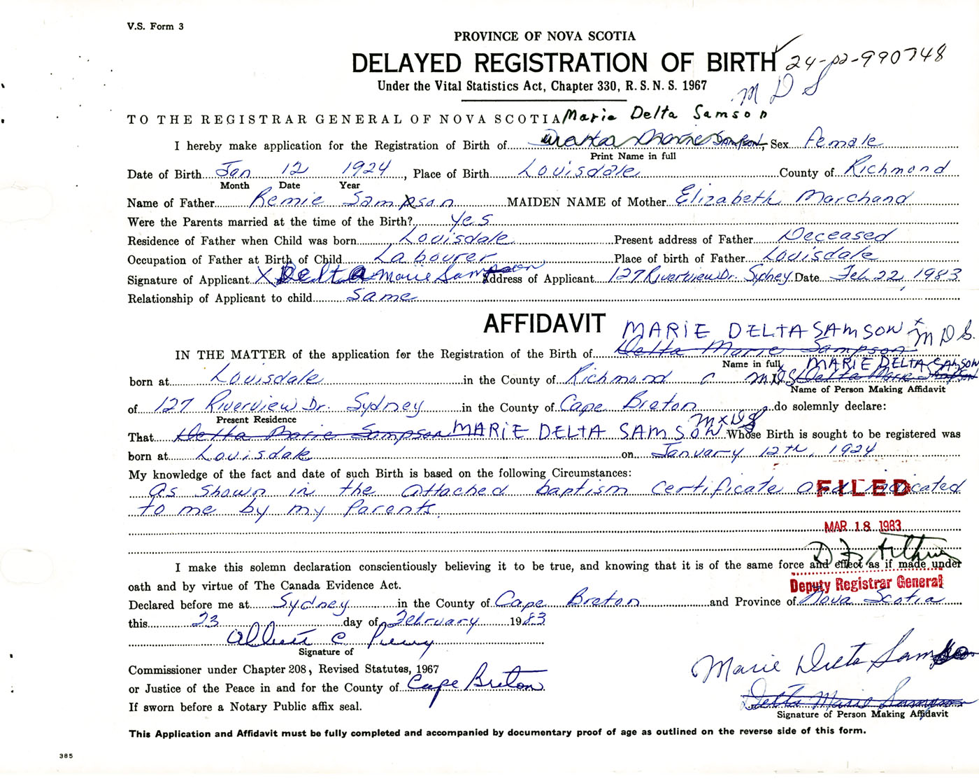 Signature of Applicant Delta Marie Samson Address of Applicant 127 Riverview Drive, Sydney, Cape Breton Co., NS Date 22 February 1983