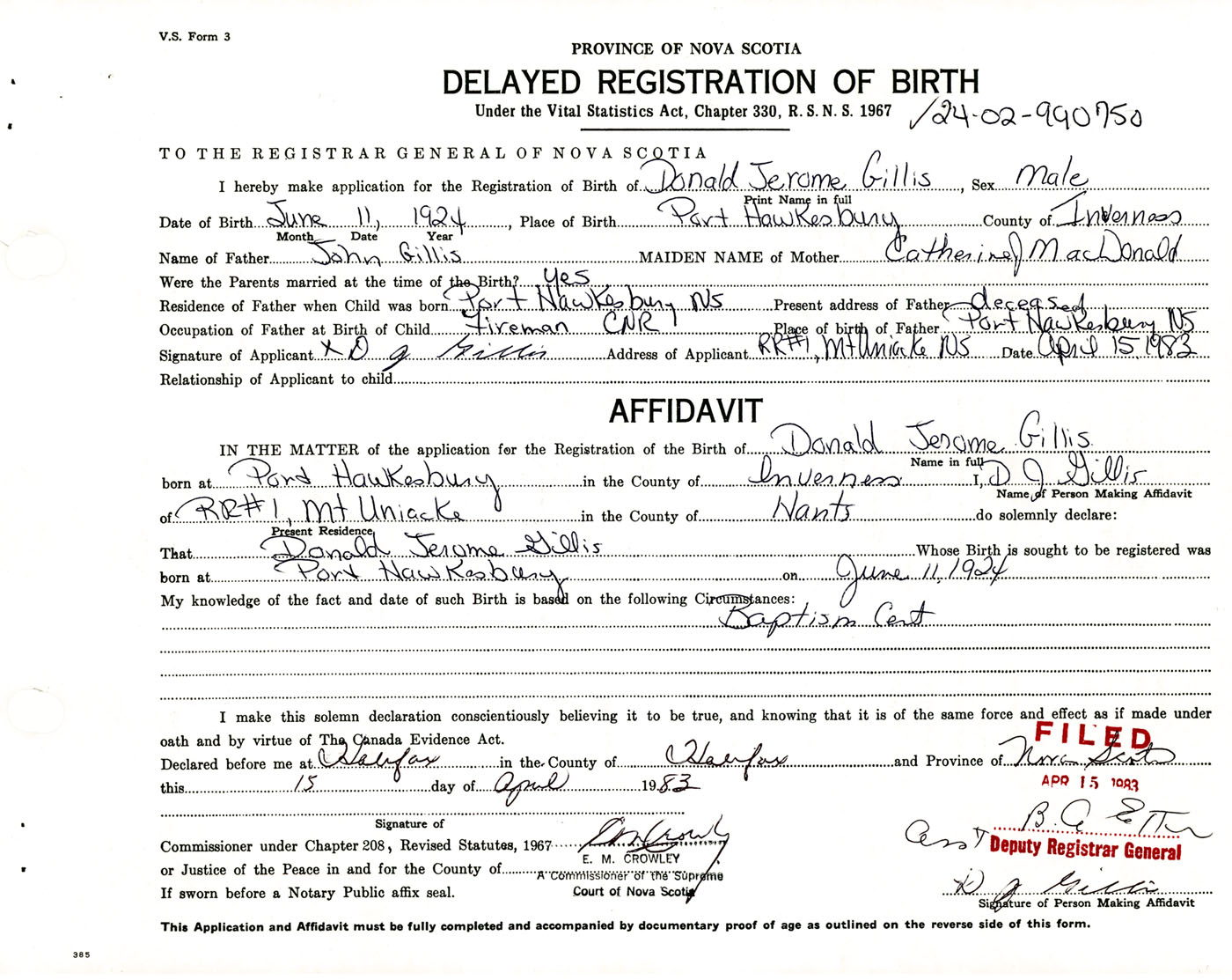 I hereby make application for the Registration of Birth of Donald JeromeGillis Sex Male