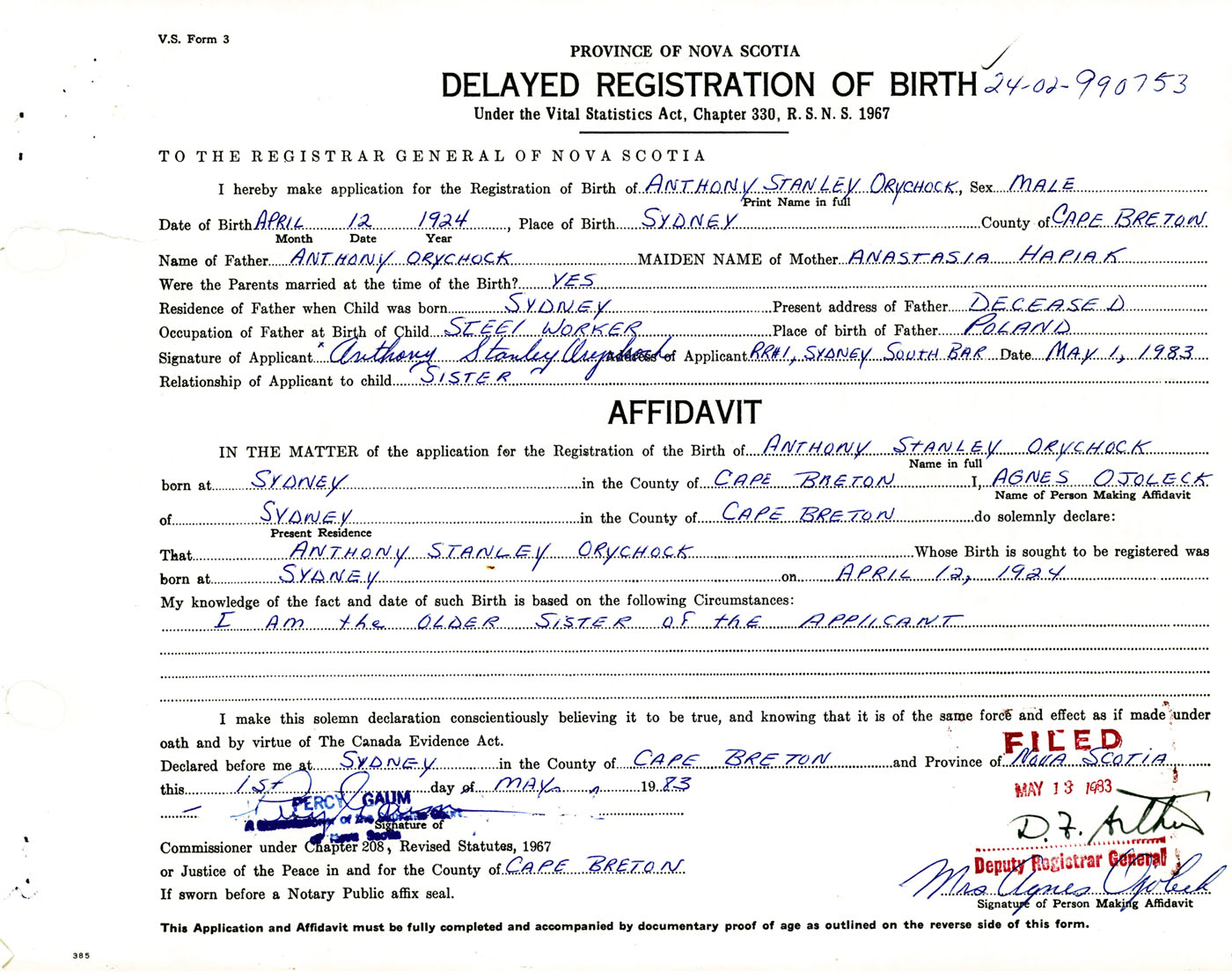 I hereby make application for the Registration of Birth of Anthony StanleyOrychock Sex Male