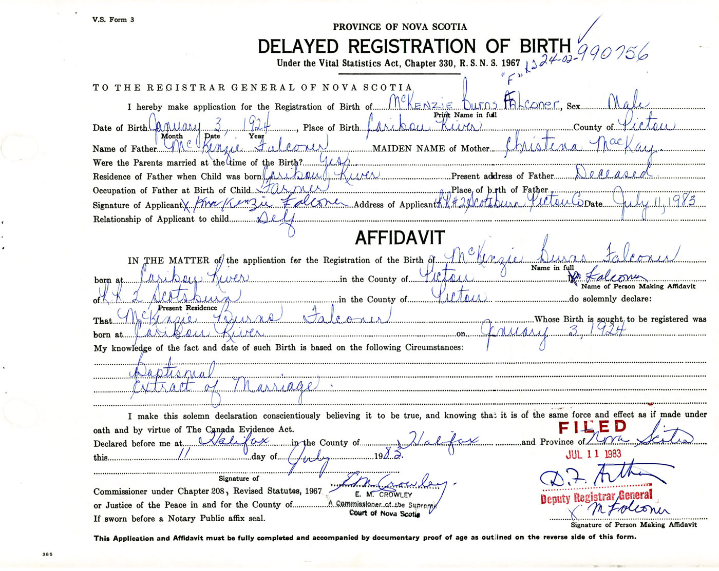 Signature of Applicant McKenzie Falconer Address of Applicant RR #2, Scotsburn, Pictou Co., NS Date 11 July 1983