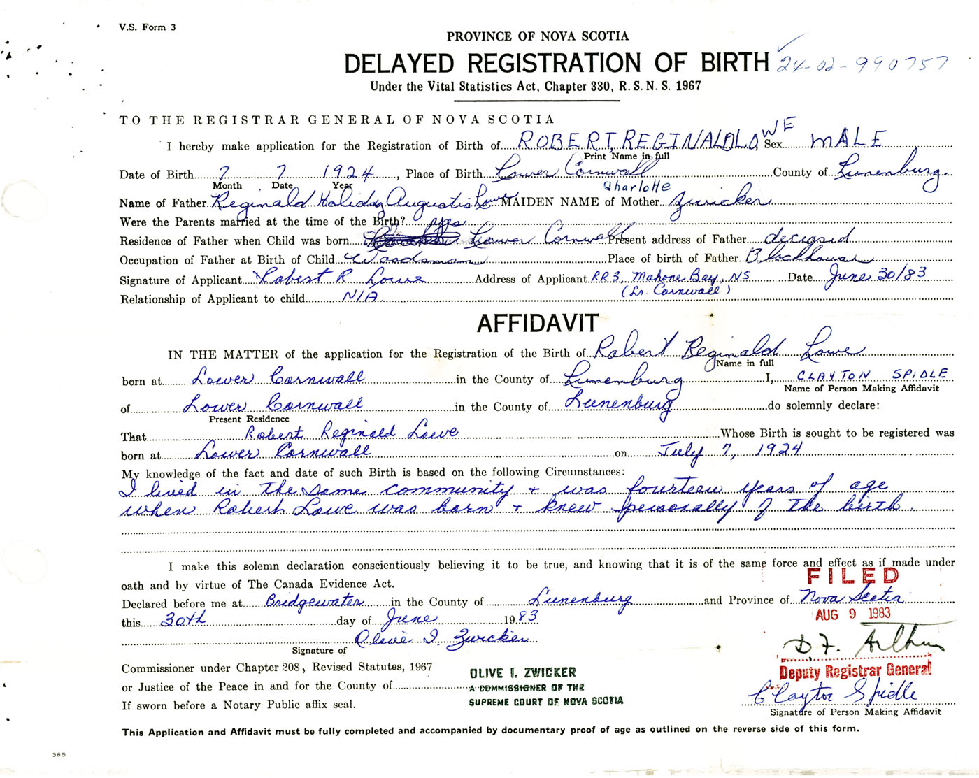 Signature of Applicant Robert R. Lowe Address of Applicant RR #3, Mahone Bay, Lower Cornwall, Lunenburg Co., NS Date 30 June 1983