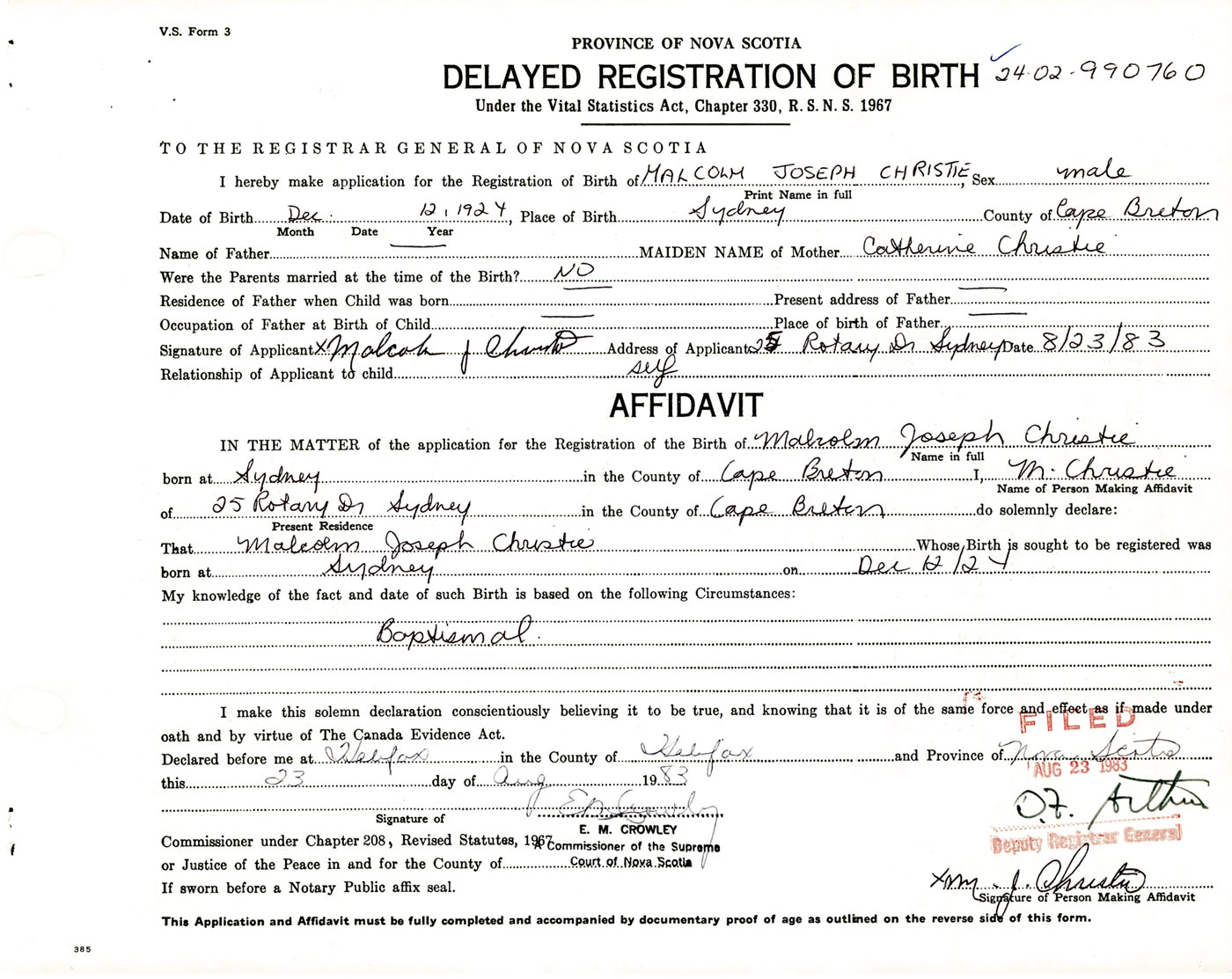 Signature of Applicant Malcolm J. Christie Address of Applicant 25 Rotary Drive, Sydney, Cape Breton Co., NS Date 23 August 1983