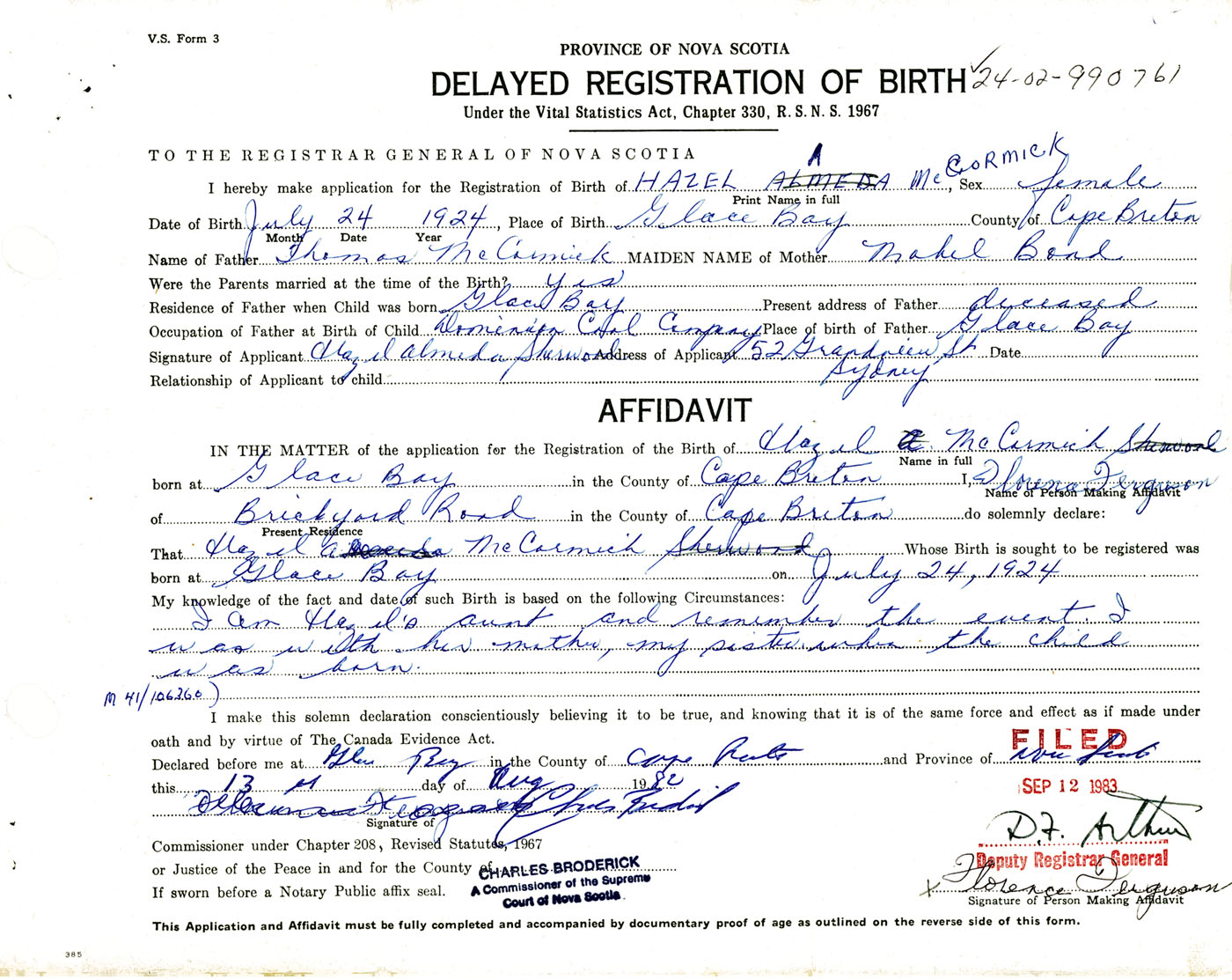 Signature of Applicant Hazel Almeda Sherwood Address of Applicant 52 Grandview Street, Sydney, Cape Breton Co., NS Date August 1982