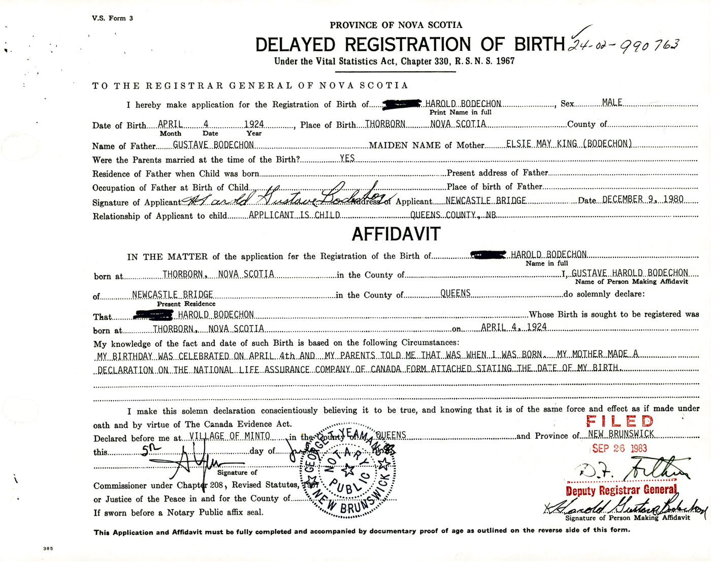 Signature of Applicant Harold Gustave Bodechon Address of Applicant Newcastel Bridge, Queens Co., New Brunswick Date 9 December 1980