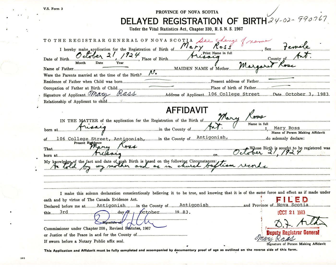 Signature of Applicant Mary Ross Address of Applicant 106 College Street, Antigonish, NS Date 3 October 1983