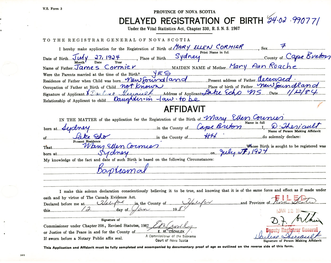 IN THE MATTER of the application for the Registration of the Birth of Mary EllenCormier