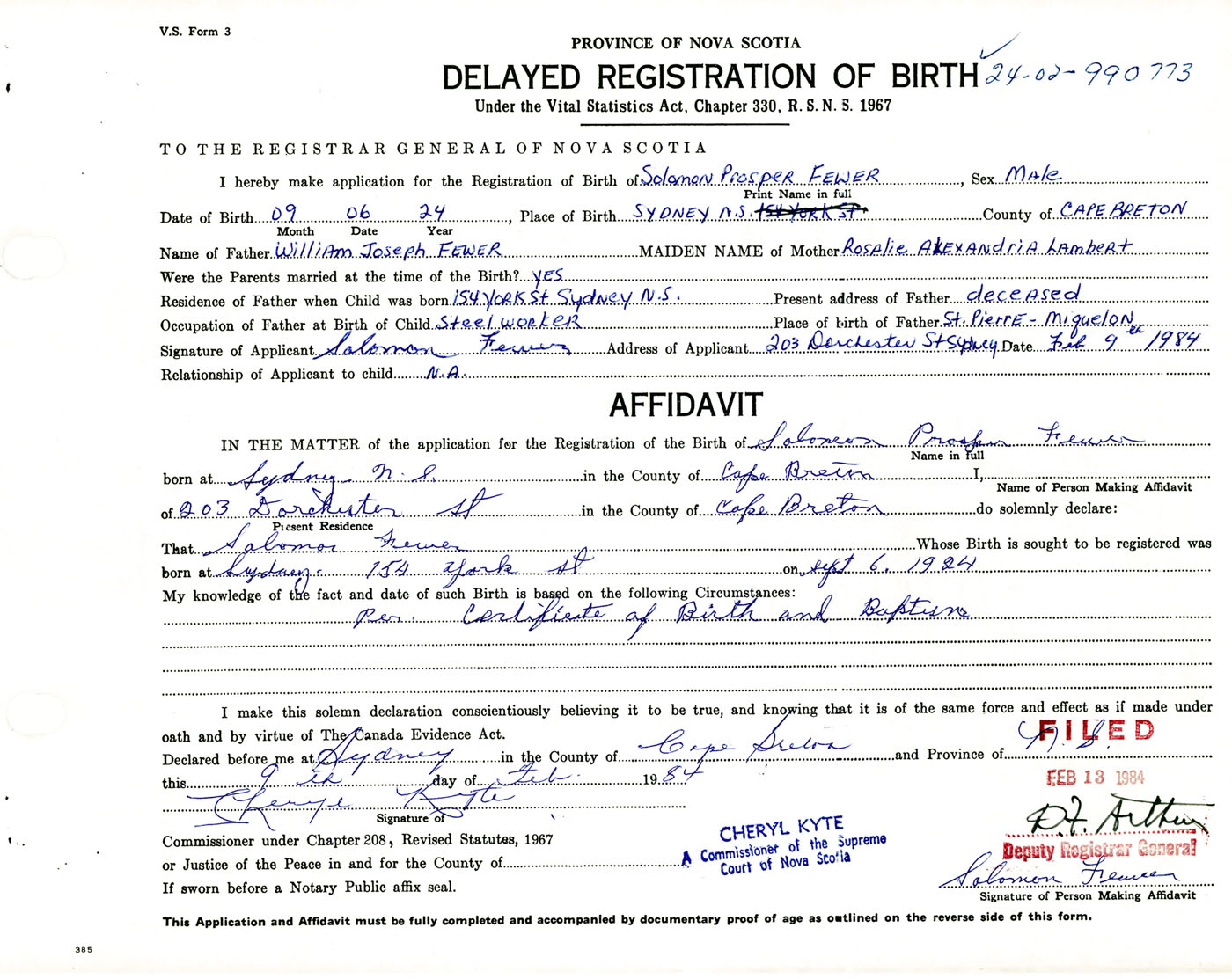 Signature of Applicant Solomon Fewer Address of Applicant 203 Dorchester Street, Sydney, Cape Breton Co., NS Date 9 February 1984