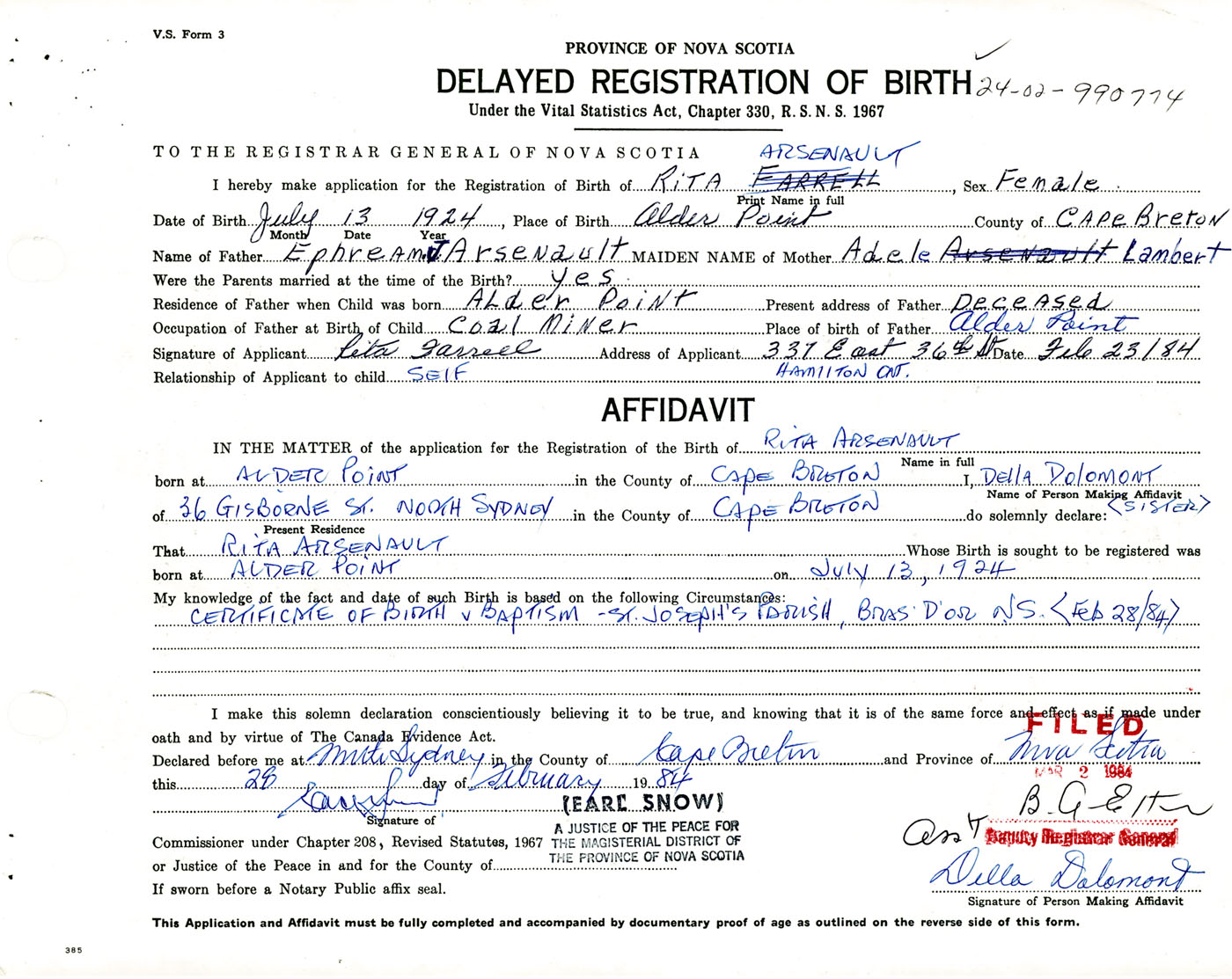 IN THE MATTER of the application for the Registration of the Birth of RitaArsenault