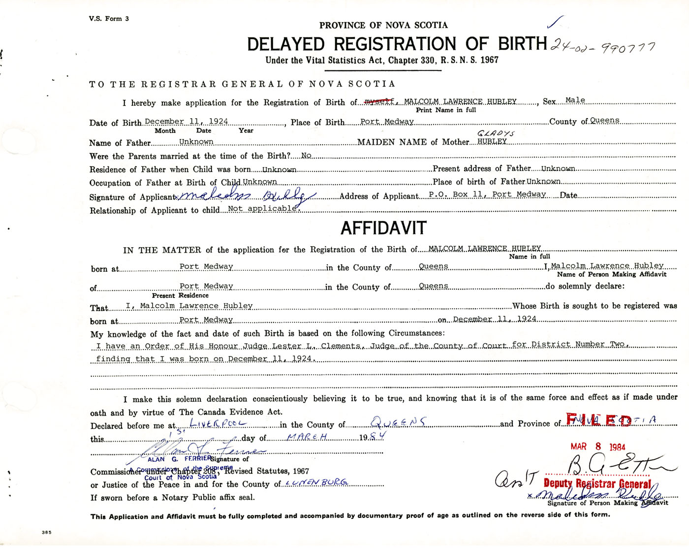 Signature of Applicant Malcolm Hubley Address of Applicant PO Box 11, Port Medway, Queens Co., NS Date March 1984