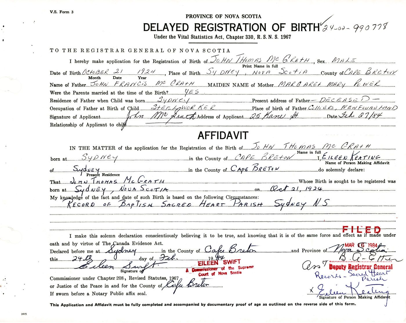 I hereby make application for the Registration of Birth of John ThomasMcGrath Sex Male