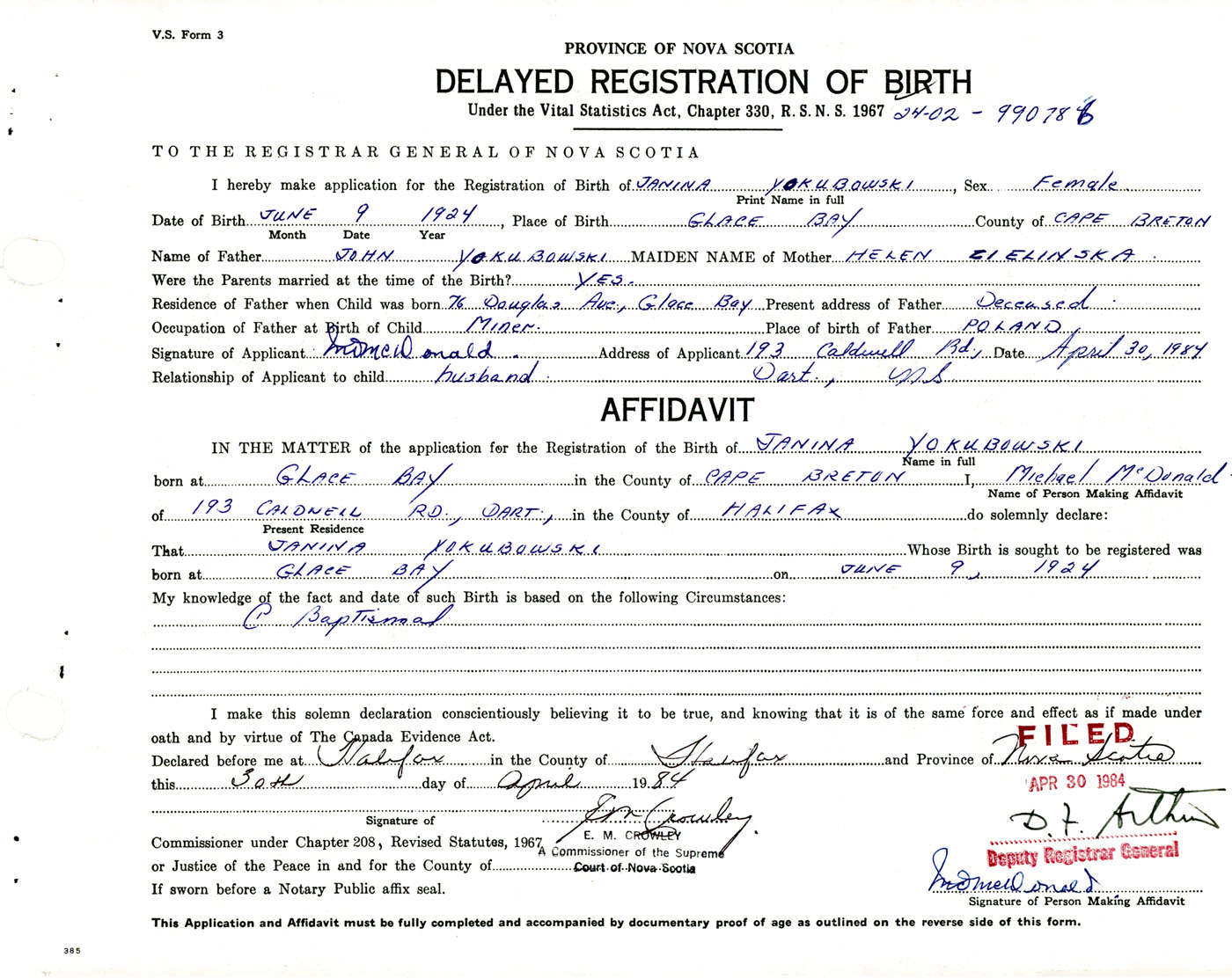 IN THE MATTER of the application for the Registration of the Birth of JaninaYokubowski