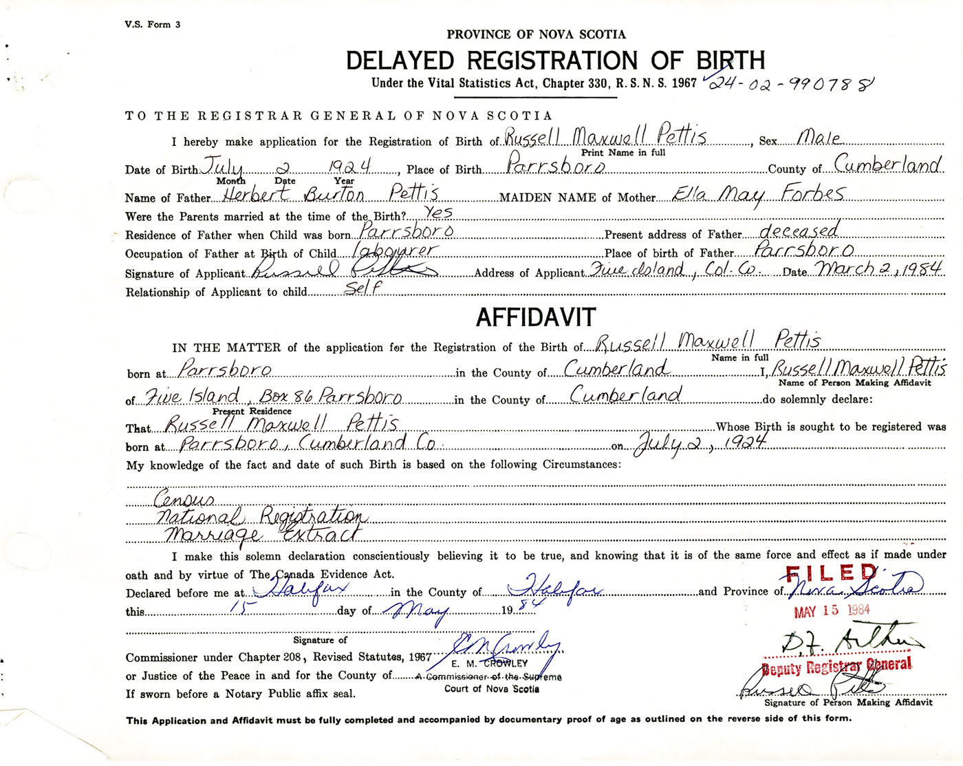 Signature of Applicant Russell Pettis Address of Applicant Five Islands, Colchester Co., NS Date 2 March 1984