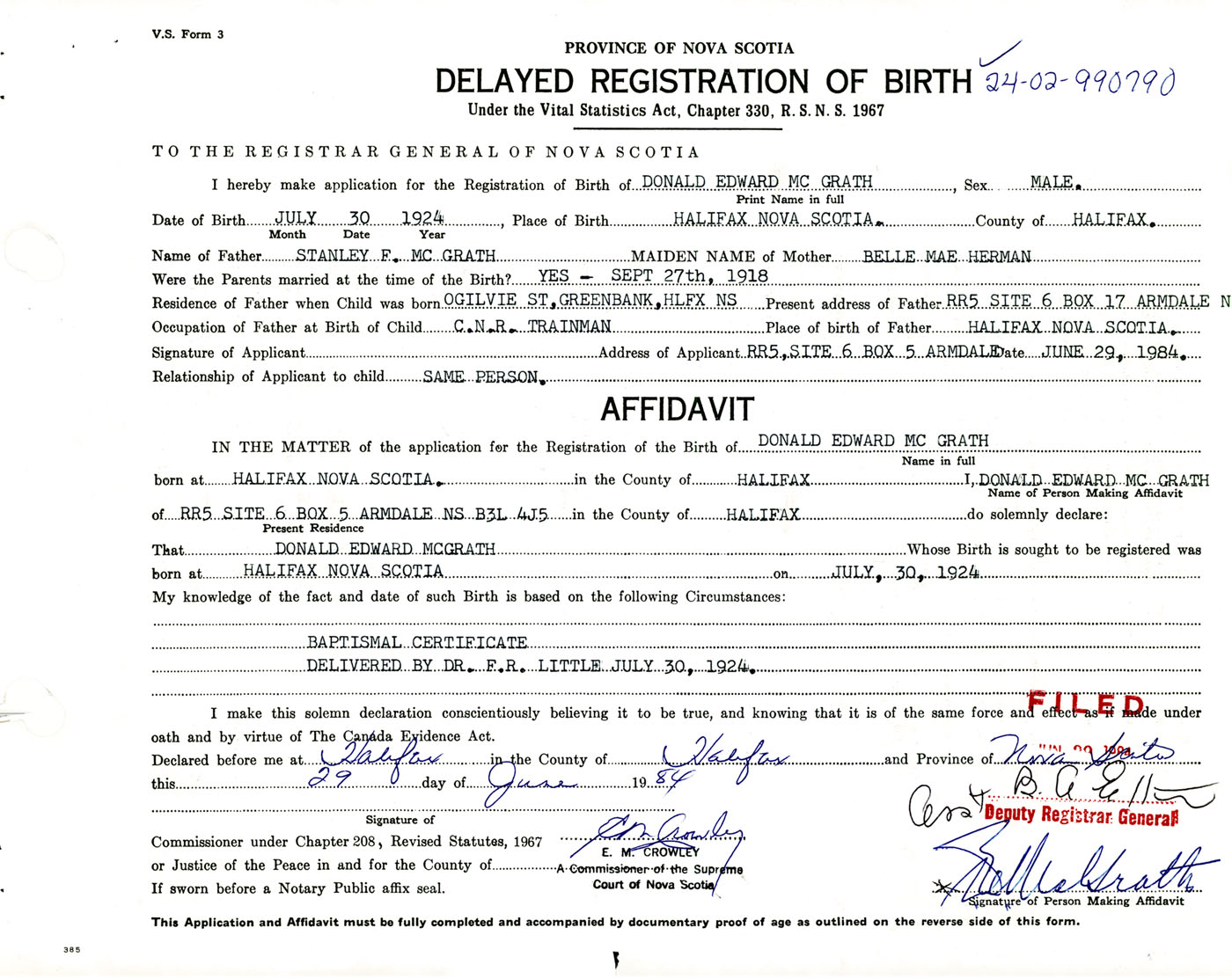 I hereby make application for the Registration of Birth of Donald EdwardMcGrath Sex Male