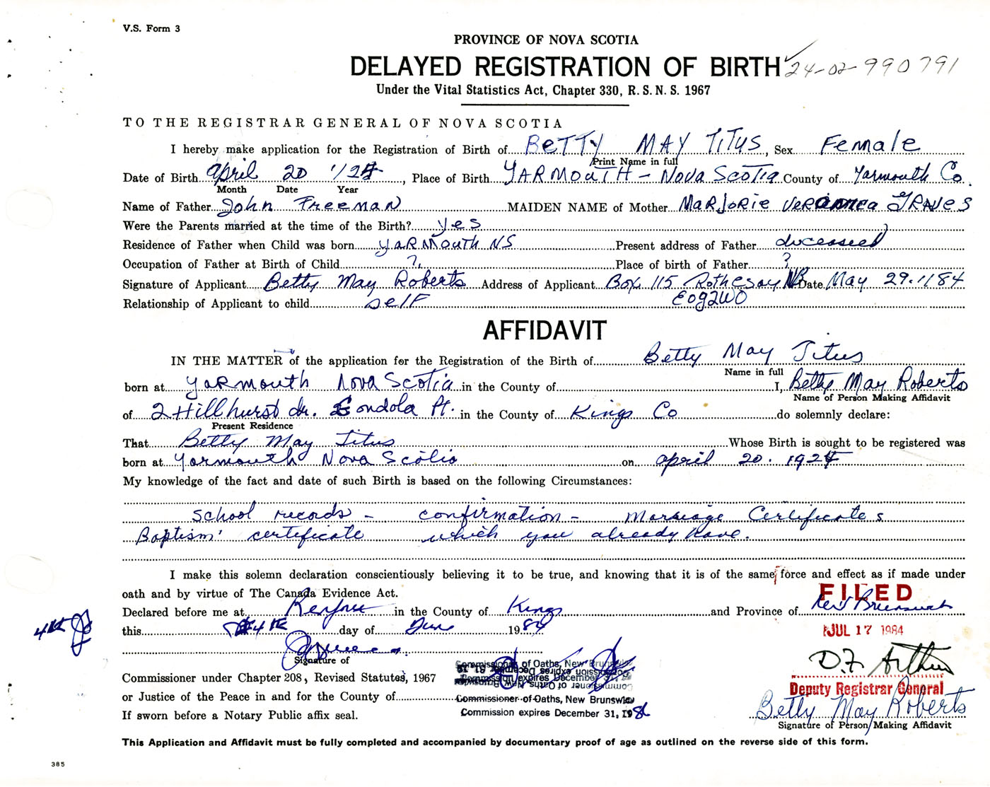 I hereby make application for the Registration of Birth of Betty MayTitus Sex Female