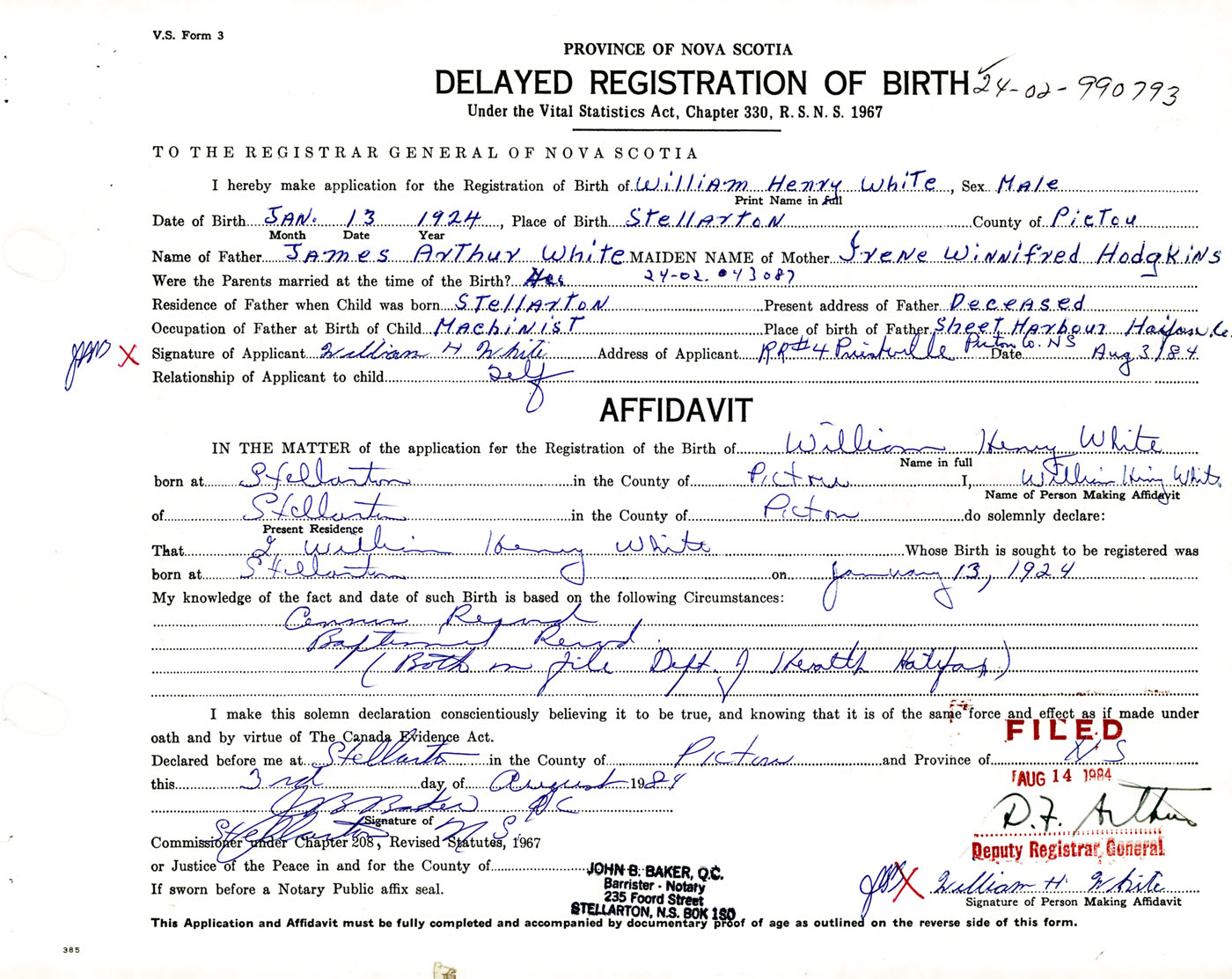 Signature of Applicant William H. White Address of Applicant RR #4, Priestville, Pictou Co., NS Date 3 August 1984