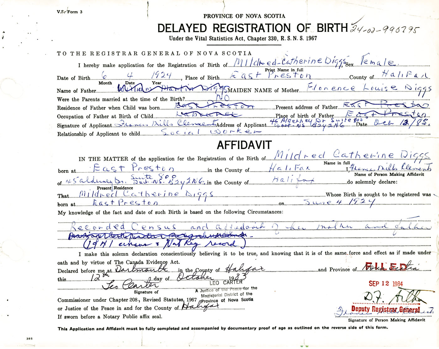 That Mildred CatherineDiggs Whose Birth is sought to be registered was