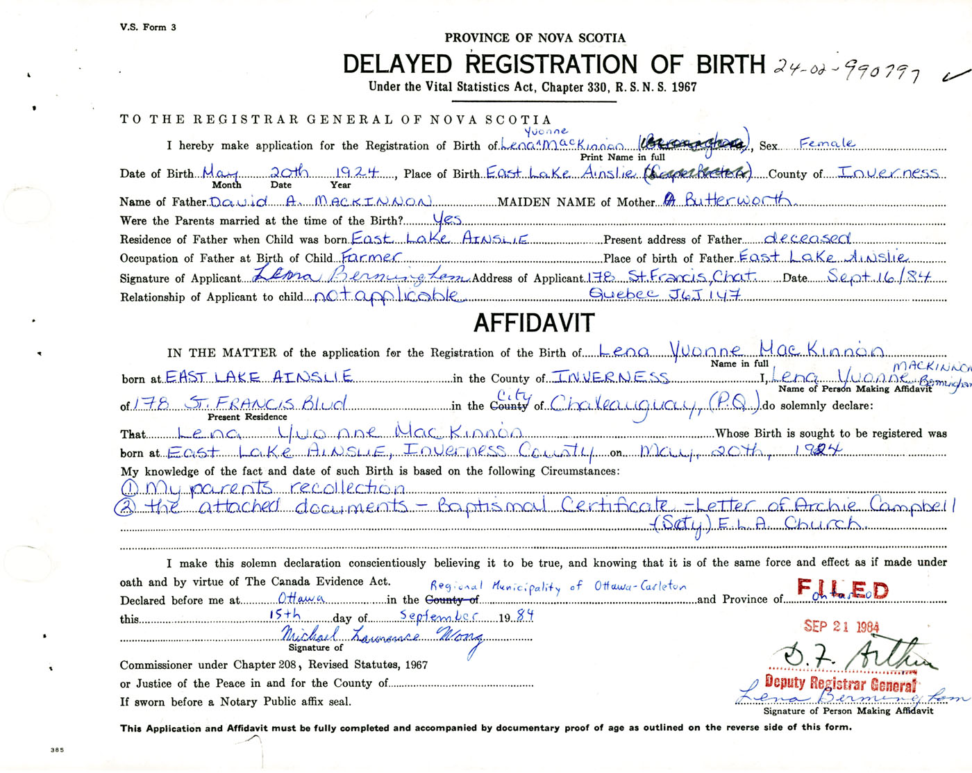 I hereby make application for the Registration of Birth of Lena YvonneMacKinnon Sex Female