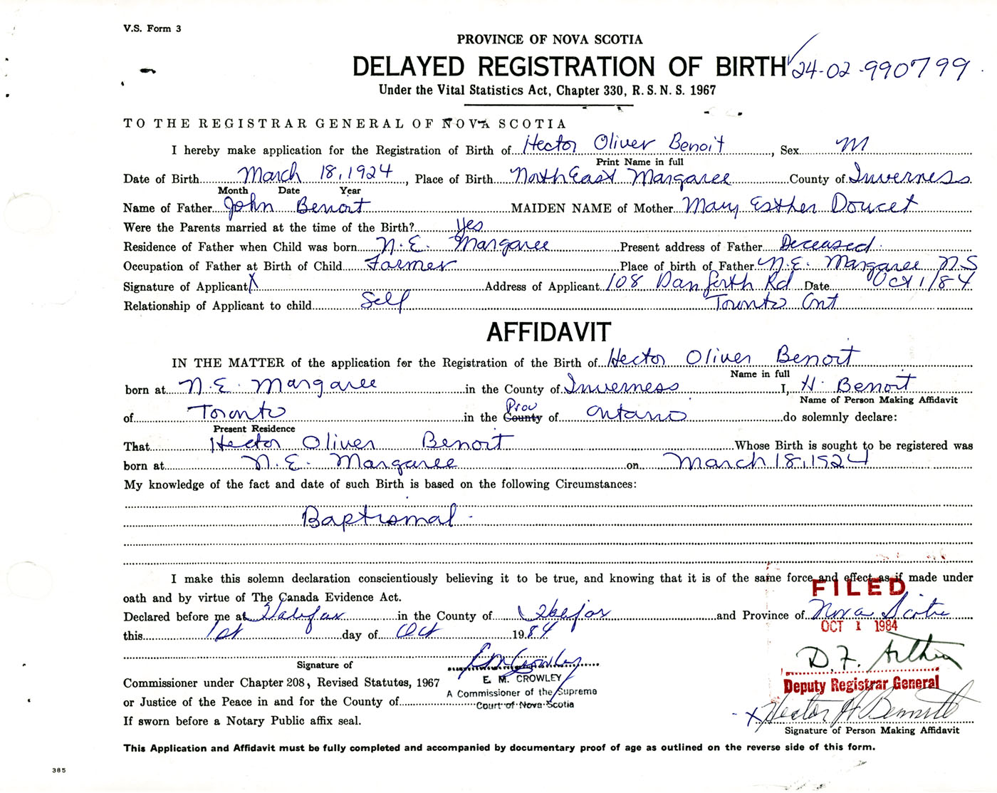 Signature of Applicant Hector A. Bennett Address of Applicant 108 Danforth Avenue, Toronto, Ontario Date 1 October 1984