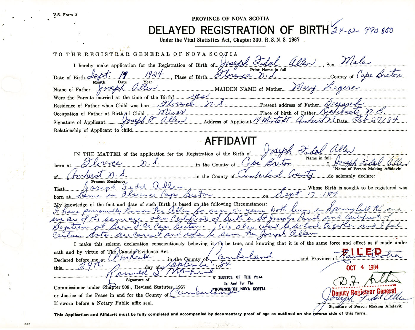 I have personally known Mr. Allen for over 50 years both living in Springhill NS and we are the same age also Certificate of Birth in St. Joseph's Parish and Certificate of Baptism at Bras d'Or Cape Breton. We also went to school together and I feel certain dates are correct and refer to same Mr. Joseph Allen