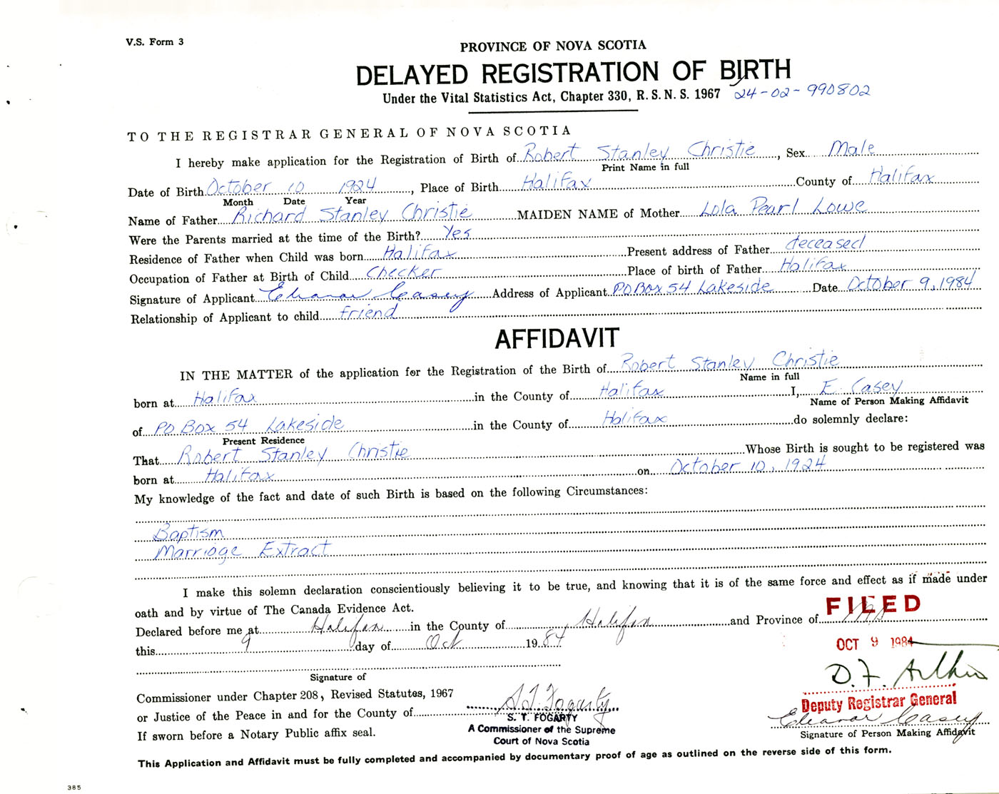 I hereby make application for the Registration of Birth of Robert StanleyChristie Sex Male