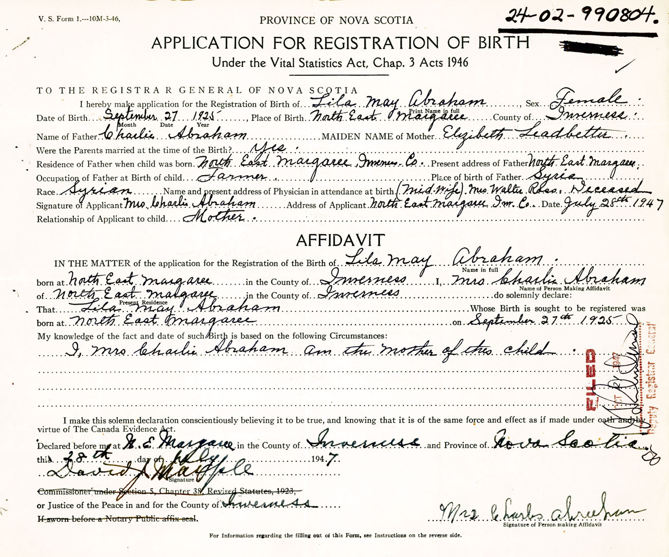 Signature of Applicant Mrs. Charlie Abraham Address of Applicant North East Margaree Date July 28, 1947