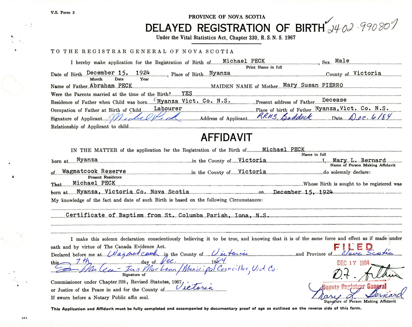 14. Certificate of Baptism from St. Columba Parish, Iona, N.S.