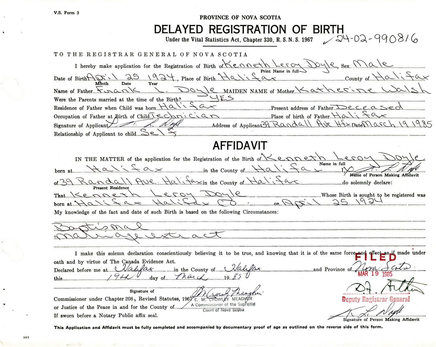 I hereby make application for the Registration of Birth of Kenneth LeroyDoyle Sex Male