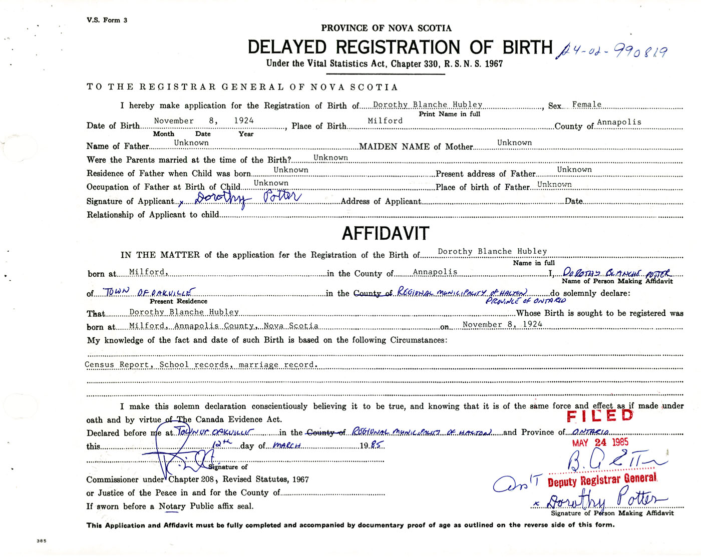 Female Birth Registration: Year: 1924 number: 99000819