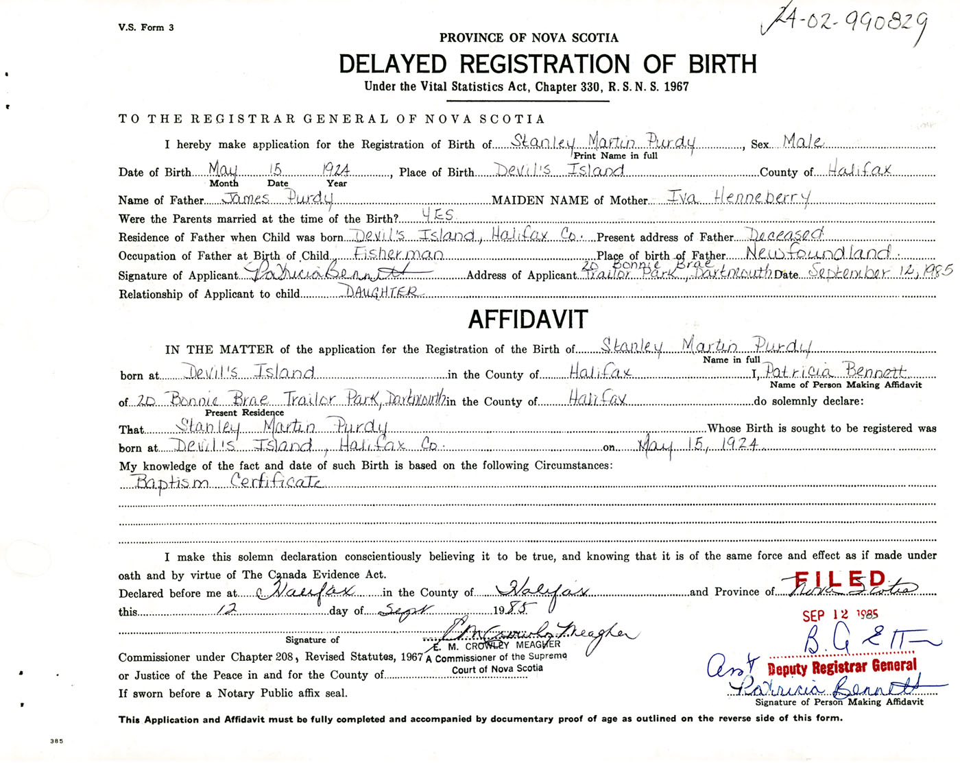 IN THE MATTER of the application for the Registration of the Birth of Stanley MartinPurdy