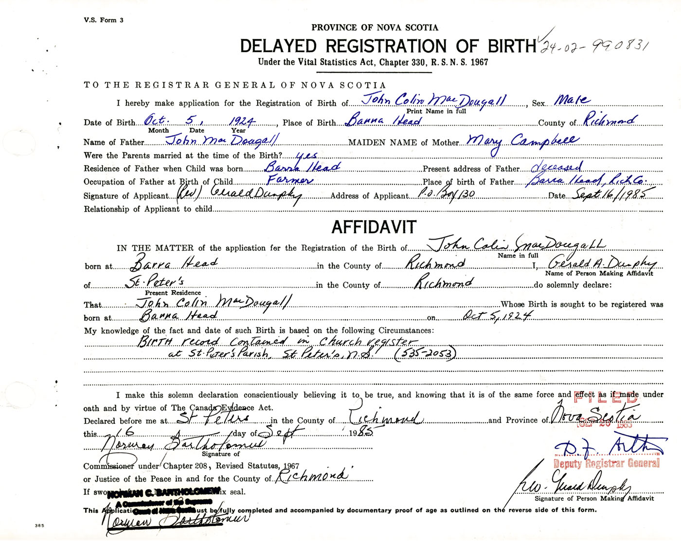 14. Birth record contained in Church register at St. Peter's Parish, St. Peter's N.S. (535-2053)
