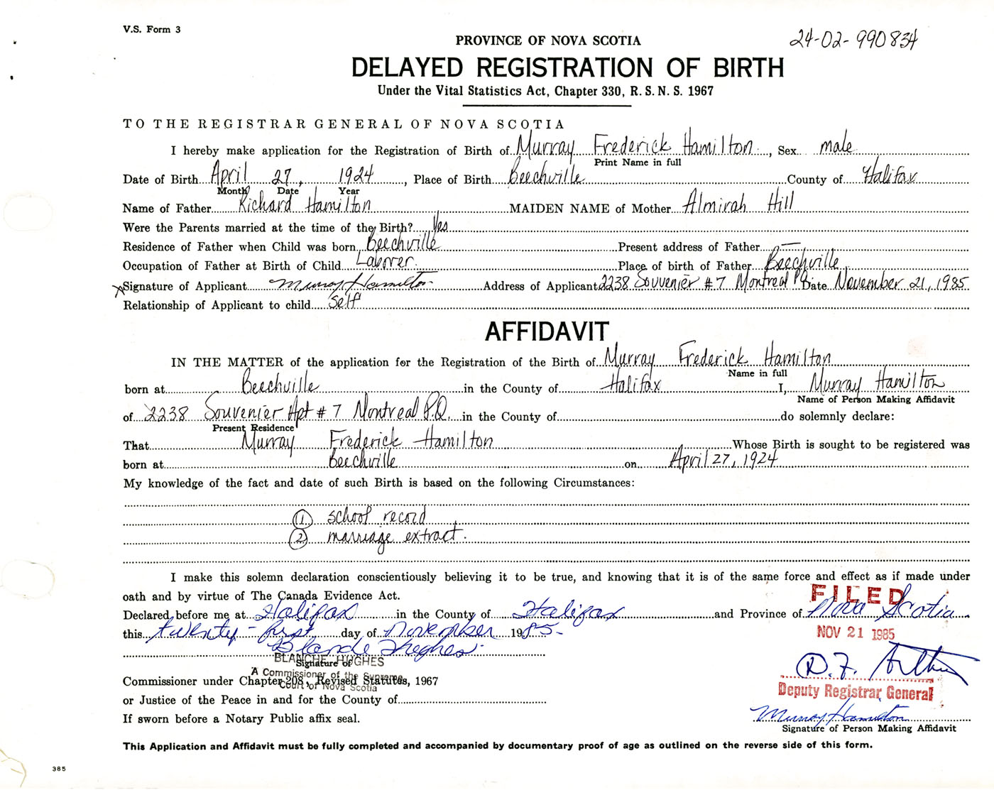 I hereby make application for the Registration of Birth of Murray FrederickHamilton Sex Male